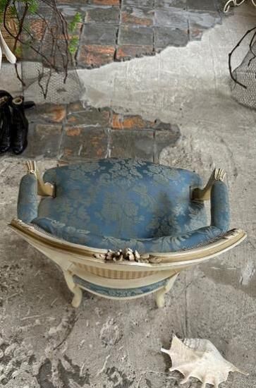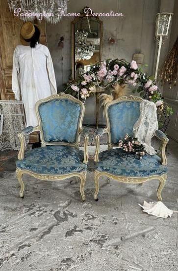 フレンチアンティークのローズ彫刻のサロンアームチェア。豪華なブルーサテンジャガード生地張りとエクリュカラーのルイ15世アンティークソファです。ロココ調フレームは背もたれからアームの先まで流れる曲線を描いています。センターにローズが彫刻された優雅な美しさを放つサロンアームチェア。ホワイトの塗装が年月を経てエクリュ色に変化していて味がありながらも落ち着きのある威厳を感じさせます。背もたれは光沢のあるサテンジャガードの鮮やかなとブルーと刺繍の柄が輝きます。美しい曲線のアームもファブリック張りでフロントから見ると脚へとつながる美しいシルエットを描いています。座面の下のチェアレールもアカンサスと花の透かし模様で飾られて。脚はカブリオールレッグで、ちょこんと立つ姿が華奢で優雅な印象です。前足には車輪がついていて、移動させやすいデザインです。ダイニングチェアーやリビングで豪華なカフェの時間を楽しんだり、存在感を発揮してくれます。煌びやかな雰囲気が絵になる佇まいのフレンチアンティークのローズ彫刻のサロンアームチェアーです。