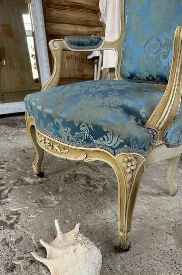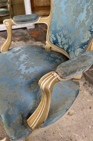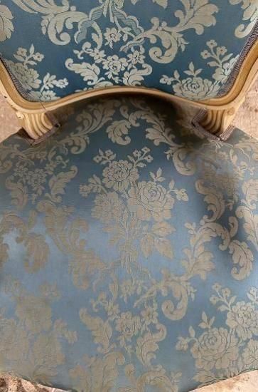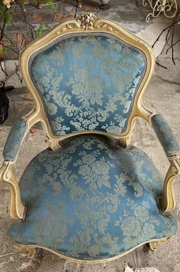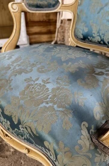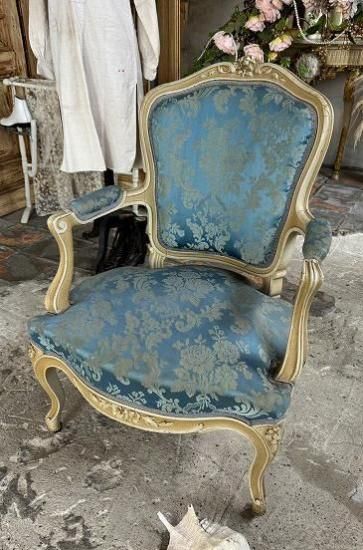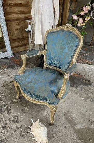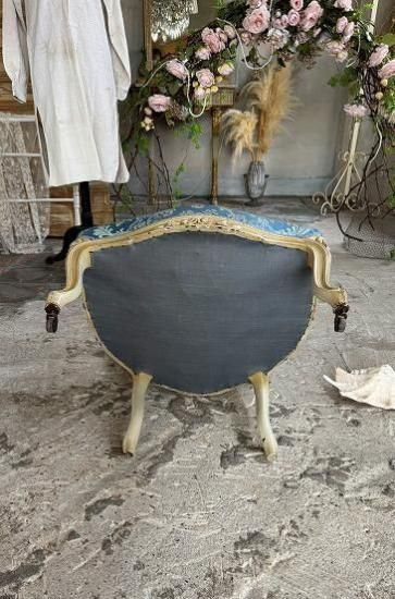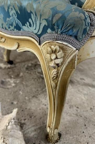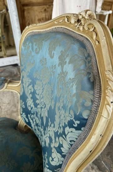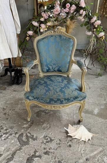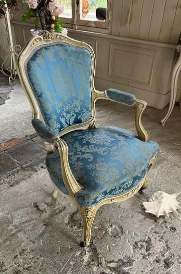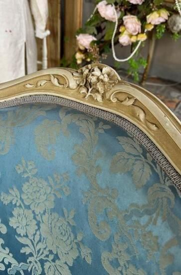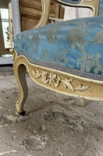 フレンチアンティークのローズ彫刻のサロンアームチェア。豪華なブルーサテンジャガード生地張りとエクリュカラーのルイ15世アンティークソファです。