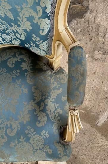 背もたれは光沢のあるサテンジャガードの鮮やかなとブルーと刺繍の柄が輝きます。美しい曲線のアームもファブリック張りでフロントから見ると脚へとつながる美しいシルエットを描いています。