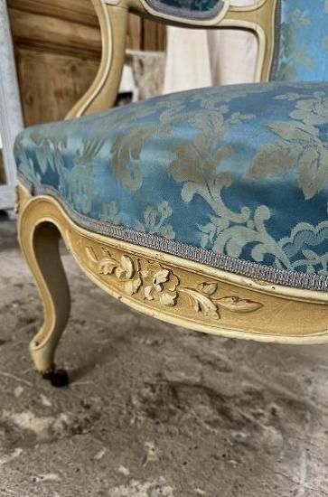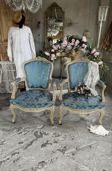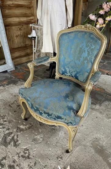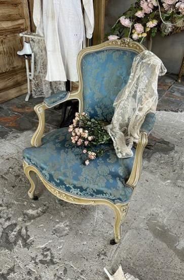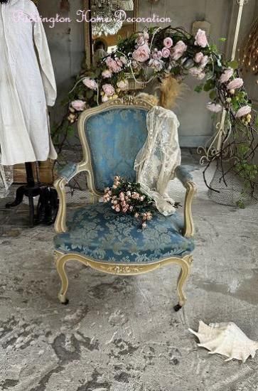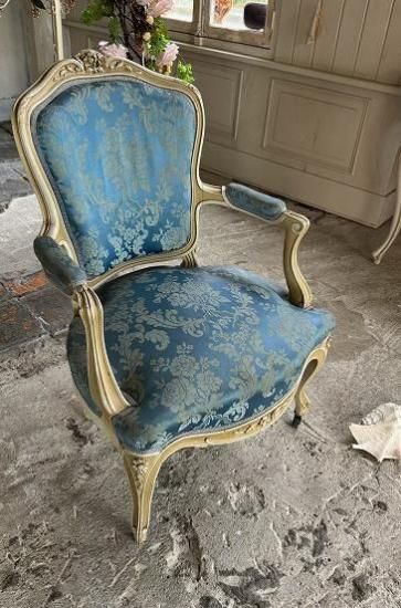 ![]() フレンチアンティークのローズ彫刻のサロンアームチェア。豪華なブルーサテンジャガード生地張りとエクリュカラーのルイ15世アンティークソファです。 | ![]() ロココ調フレームは背もたれからアームの先まで流れる曲線を描いています。センターにローズが彫刻された優雅な美しさを放つサロンアームチェア。 | ||||||||||||||
