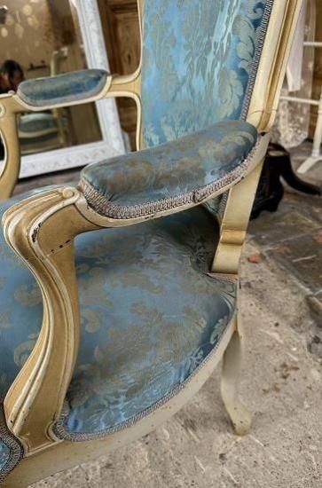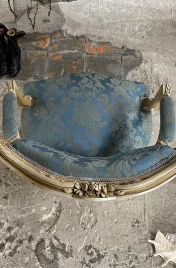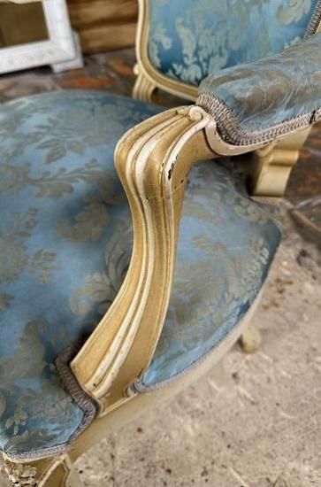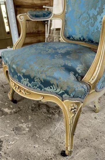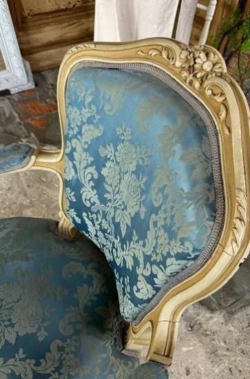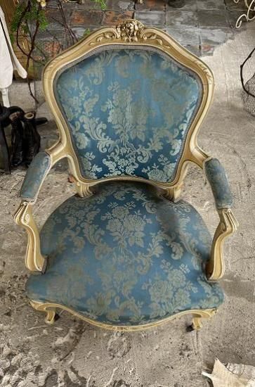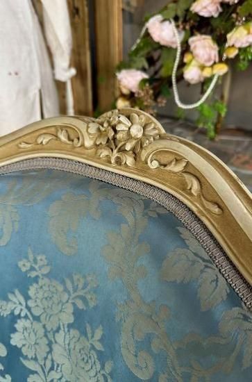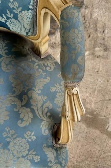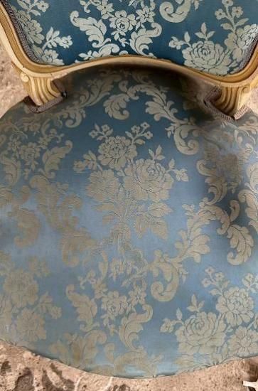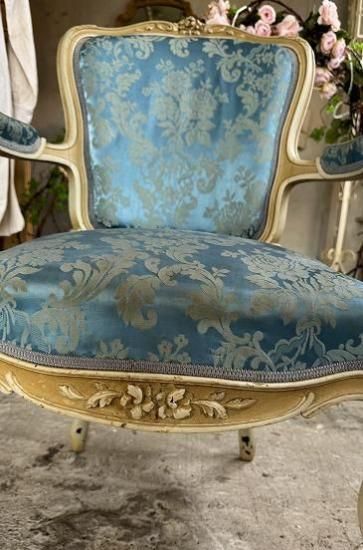 ![]() ホワイトの塗装が年月を経てエクリュ色に変化していて味がありながらも落ち着きのある威厳を感じさせます。 | ![]() 背もたれは光沢のあるサテンジャガードの鮮やかなとブルーと刺繍の柄が輝きます。美しい曲線のアームもファブリック張りでフロントから見ると脚へとつながる美しいシルエットを描いています。 | ||||||||||||||