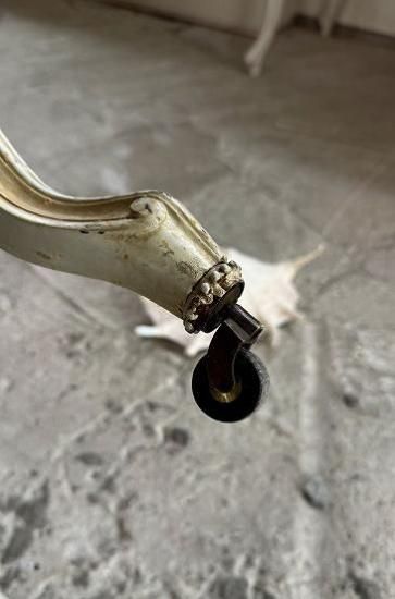 ![]() 座面の下のチェアレールもアカンサスと花の透かし模様で飾られて。脚はカブリオールレッグで、ちょこんと立つ姿が華奢で優雅な印象です。 | ![]() 前足には車輪がついていて、移動させやすいデザインです。ダイニングチェアーやリビングで豪華なカフェの時間を楽しんだり、存在感を発揮してくれます。 | ||||||||||||||