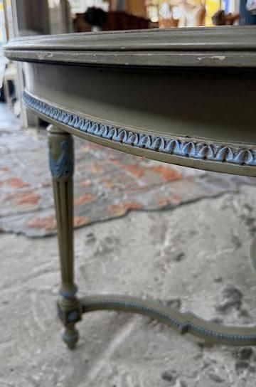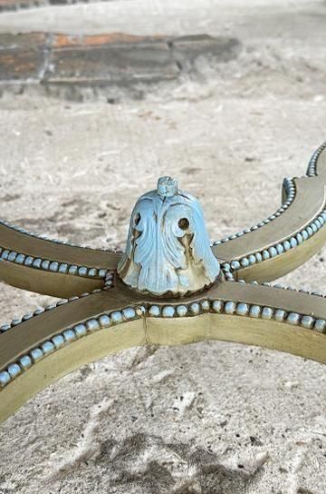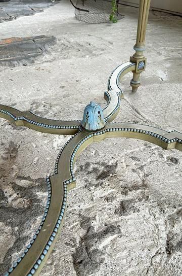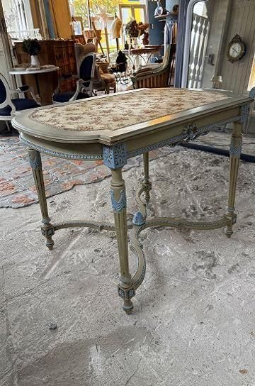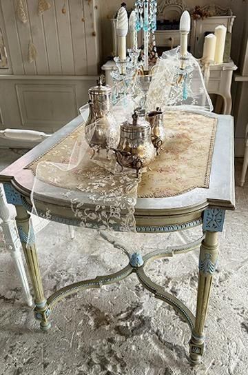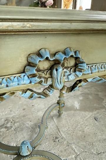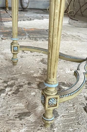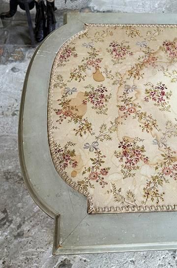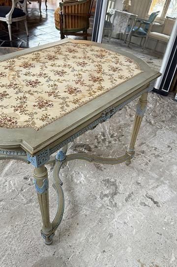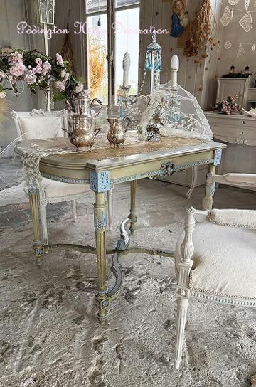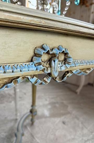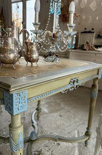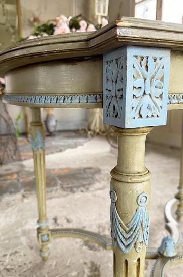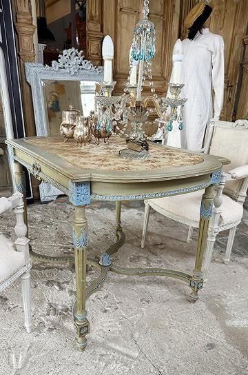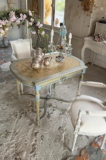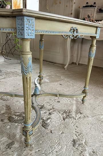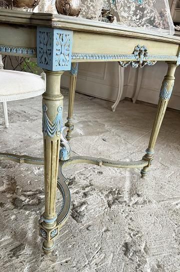 ![]() 細身な脚の付け根にリボンスワッグの彫刻に縦ストライプのクリストレイルの美しいルイ16世フレンチテーブルです。 | ![]() モス地にアクセントのターコイズブルーが新鮮なオリジナルコンディションのアンティークテーブルです。 | ||||||||||||||