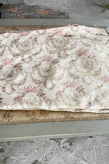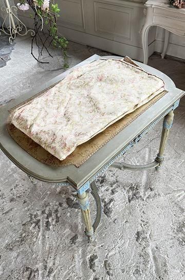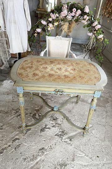 フレンチアンティークのルイ16世センターテーブル。細身な脚の付け根にリボンスワッグの彫刻に縦ストライプのクリストレイルの美しいルイ16世フレンチテーブルです。モス地にアクセントのターコイズブルーが新鮮なオリジナルコンディションのアンティークテーブルです。天板は花を飾るのに美しい楕円形、ローズとリボンの織り成すシルク製ジャガードが張られています。コーナーにはハスク模様が、テーブルに沿ってガドルーニング、足元には細かいビーズネックレスのようにビーディングされています。シンメトリーに中央にはリボンの彫刻が施されたシャープで品位のある立体的なルイ16世テーブルです。華奢な脚は直線的なフルーディングの丸脚で、ルイ16世スタイルならでは。もちろん取り入れやすいサイズなので、玄関先のディスプレイテーブルに、又、ドレッサーテーブルにしたり、スタジオを飾る装飾家具、ショップの撮影用テーブルとしても役に立ちそうです。シャトーの一室の私室や寝室を飾っていた、ルイ16世様式のフラワーセンターテーブルです。 | ![]() | ||||||||||||||