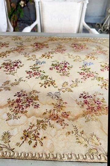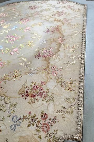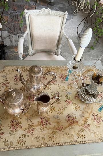 ![]() 天板は花を飾るのに美しい楕円形、ローズとリボンの織り成すシルク製ジャガードが張られています。 | ![]() コーナーにはハスク模様が、テーブルに沿ってガドルーニング、足元には細かいビーズネックレスのようにビーディングされています。 | ||||||||||||||
