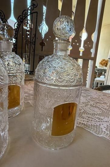 フレンチアンティークのガラスボトル。ゲラン社製のオーデコロン、ランスタン ド ゲランが入っていた、アンティークのビーボトルです。1894年発表の、ピエールの息子で2代目調香師エメ・ゲランが調合した、シトラスやフローラル、ウッドが溶けあう香水です。ピエール=フランソワ=パスカル・ゲランが1828年、パリ1区にフレグランス、スキンケアの店を創業しました。1853年、ナポレオン3世との婚礼の際、皇后ウージェニーに献上し、皇室御用達となったオーデコロンイムぺリアル。ガラスに純金で装飾されたゴールデンビーボトルは、後にゲランのアイコンとなりました。ポシュ・エ・デュ・クルヴァル社が製作した、ヴァンドーム広場の円柱をモチーフに、ナポレオン製のシンボル、69のミツバチが並ぶアンピール様式のデザインです。こちらは比較的年代の新しいボトルですが、ブティックに持っていけば何度も詰め替えて使えるボトルで、大切に受け継がれてきた事が伺えます。ガラスの透明感と、洗練されたデザインを楽しんで、ドレッサーやマントルピースを飾るオブジェとしてや、空間のラグジュアリーな雰囲気造りに。もちろんショップディスプレーにも、その由緒ある歴史を取り入れた世界観のある空間にしたい。現行品のボトルとは違った味のある佇まいの、フレンチアンティークのゲラン製オーデュコックのビーボトルです。 | ![]() | ||||||||||||||