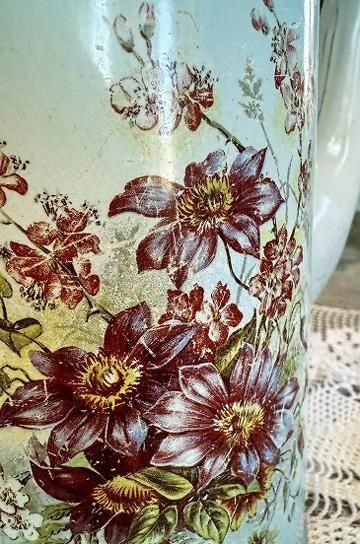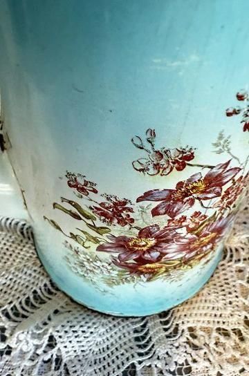 ![]() スカイブルーのグラデーションのホーロー製にフローラルの花束がパープルブラウンに転写プリントされたアンティークポット。 | ![]() 繊細な花束のパターンがスカイブルーのやさしさに溶け込んで美しいエナメルポットです。 | ||||||||||||||