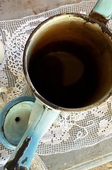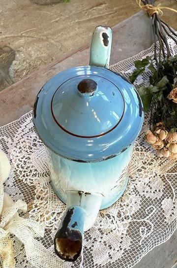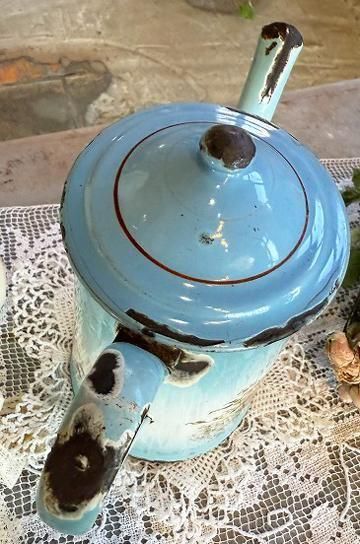 ![]() スカイブルーの深い色とホーローの艶やかさがディスプレイに生えます。 | ![]() 内側は100年の歴史を持つ古いポットなので錆びている部分はありますが水漏れはないコンディションです。 | ||||||||||||||