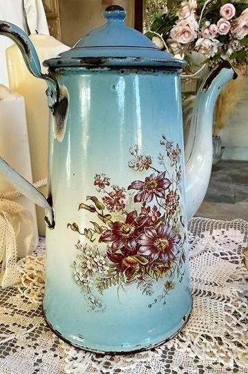 フレンチアンティークのホーロー製ポット。スカイブルーのグラデーションのホーロー製にフローラルの花束がパープルブラウンに転写プリントされたアンティークポット。繊細な花束のパターンがスカイブルーのやさしさに溶け込んで美しいエナメルポットです。スカイブルーの深い色とホーローの艶やかさがディスプレイに生えます。内側は100年の歴史を持つ古いポットなので錆びている部分はありますが水漏れはないコンディションです。ポットの縁と注ぎ口、ハンドルにはスカイブルーがうっすらと白に変わるグラデーションのデザインです。ブロカントが並ぶキッチンのディスプレーオブジェや、花瓶としてドライフラワーや季節の花を飾ったり。華やかな柄が魅力のフレンチアンティークホーローポットです。 | ![]() | ||||||||||||||