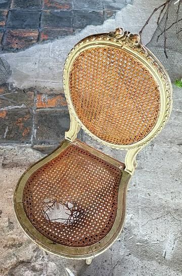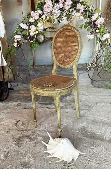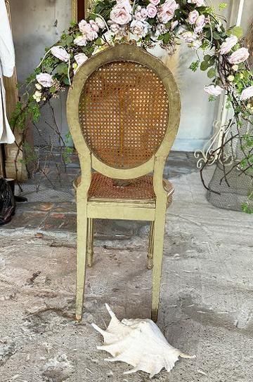 フランスアンティークのローズバルーンバックチェア。背もたレの中央には丁寧に彫刻がローズの花が2輪施されいるアンティークチェアです。背もたれのオーバル型と座面が丸形が人気のバルーンバックチェアです。オーバル形のフレームと丸い形の座面が特徴のルイ16世スタイルのアンティークチェアです。家具職人が無垢の木から削り出したカーブの美しい100年以上前の椅子です。座面には透け感のあるケイン編みが軽やかな雰囲気で、テーブルにセットした時も圧迫感無く、美しい佇まいです。ケイン編みで軽く、細身のバールーンの形は、貴婦人型を小さくこじんまりと美しく映るようにデザインされたシャトーの椅子。お城で使われていたオリジナルゴールド塗装のアンティークチェア。シックな佇まいと美しいデザインが何処に置いても絵になる、フレンチアンティークチェアです。