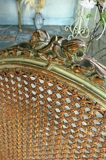備考木製にゴールドオリジナル、ローズカーヴィンぐの背もたれ。ケイン編みのバルーンバックチェア。