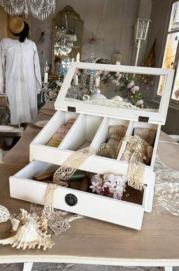 備考パイン材製にホワイト塗装のガラスの天板がケースの上に付いて。中は4つの仕切りがはいっておりこもを分けて収納御できます。引き出し付き。