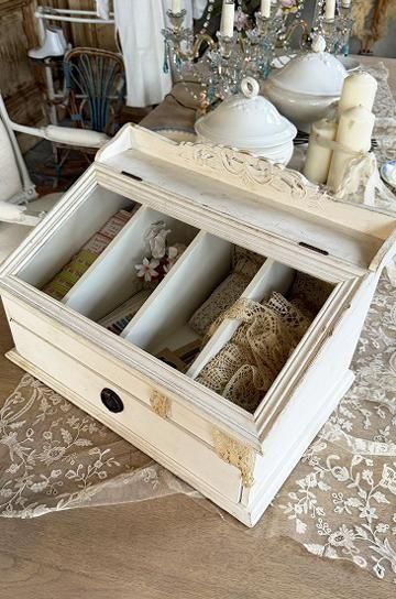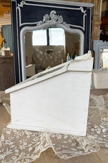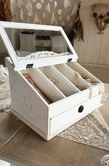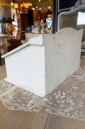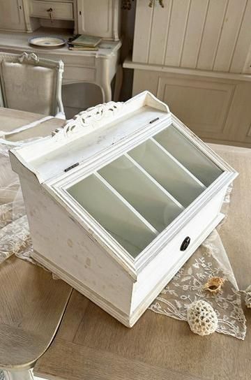 パイン材製のフレームホワイト塗装が年月の経過で剥がれかけのディスプレイケース。表面は蓋にガラスケースでのぞけるように作られていて