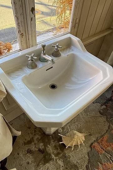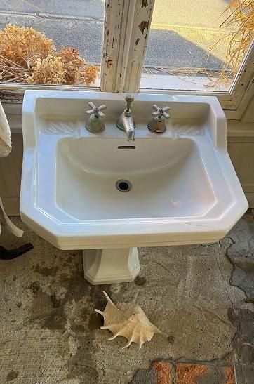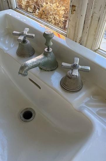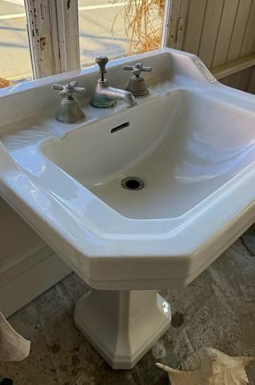 ![]() フレンチアンティークの古いペデスタルシンク。ホワイトの陶器製にメタルタップが残って、味のある佇まいのアンティークシンクです。 | ![]() オクタゴナル型のデザインと、陶器の白い艶が美しいシンクには、こちらも幾何学的な面取りがかっこいい真鍮メッキのタップが2対とレバーが残って、このまま絵になります。 | ||||||||||||||