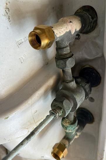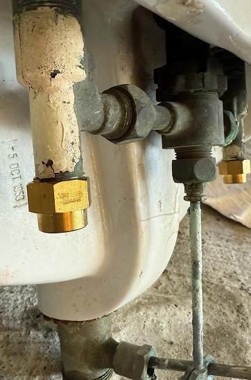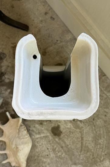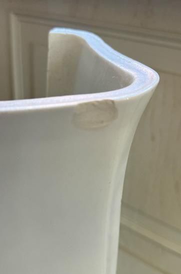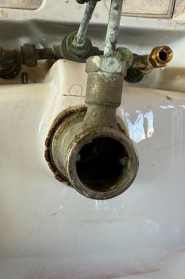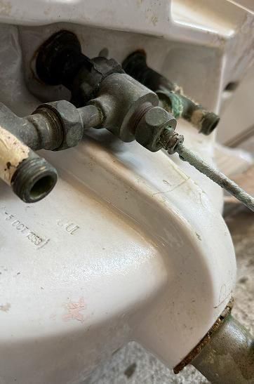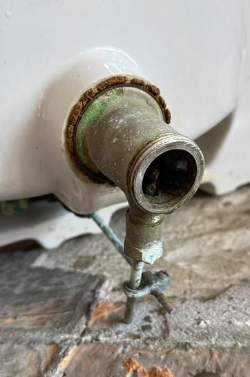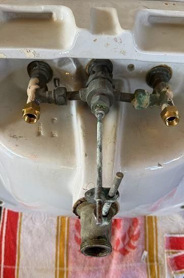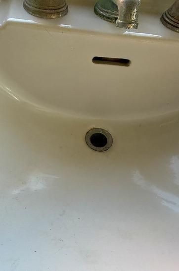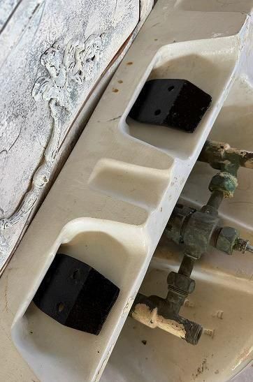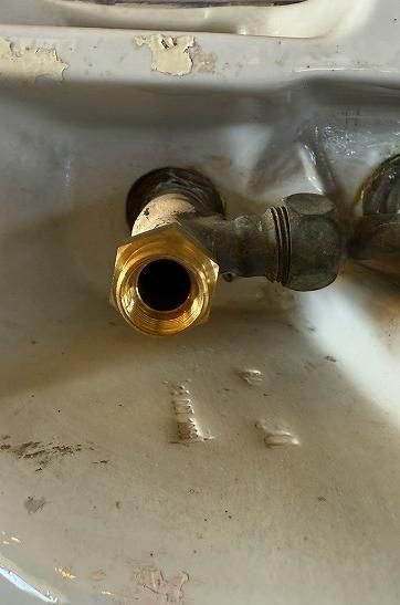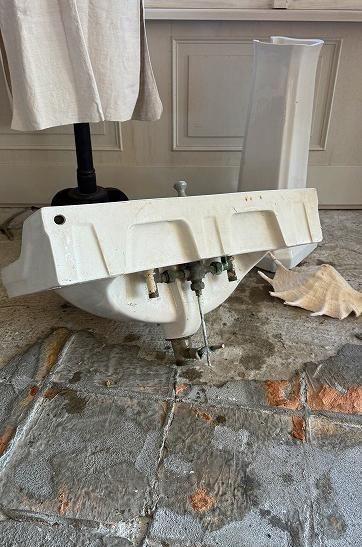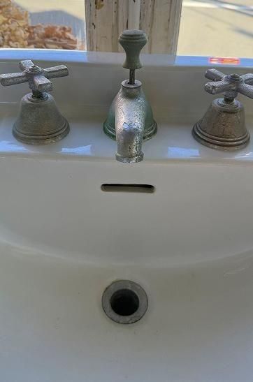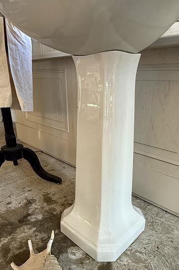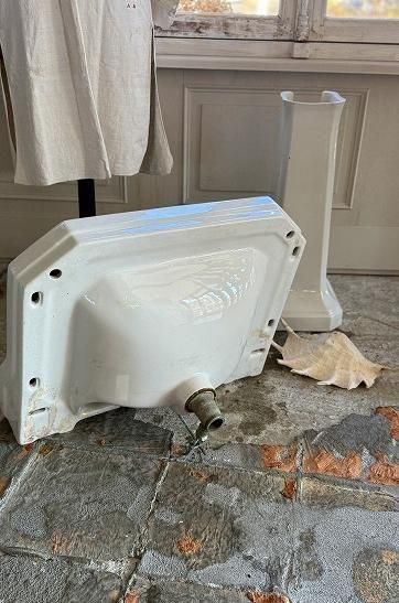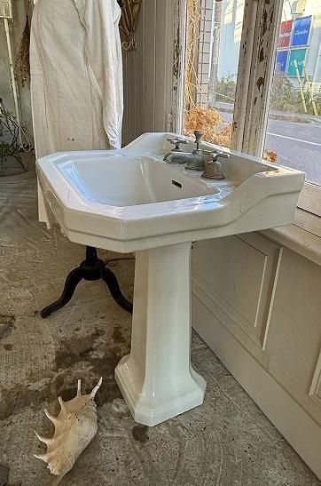 ![]() すらっと伸びた脚は、同じくオクタゴナルで、面取りが角度によって陶器の艶を反射し、美しい。壁面付けに美しく収まる、ペデスタル型のシンクです。 | ![]() このまま古いアンティーク金具が残るオブジェとしてディスプレーに取り入れたり、必要に応じてトラップや排水管等を変えれば実用も出来ます。 | ||||||||||||||