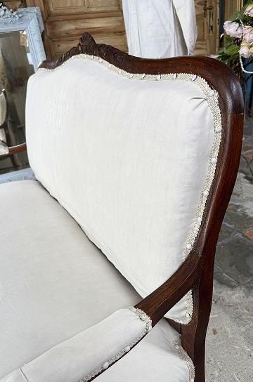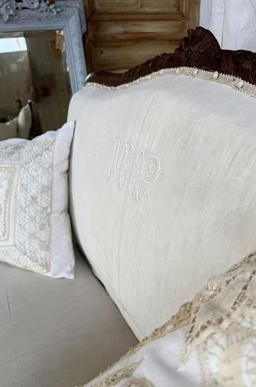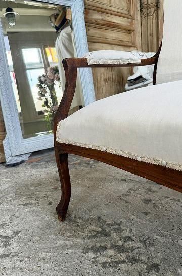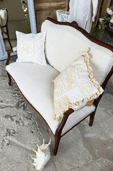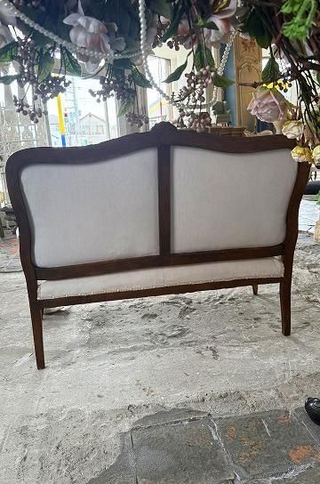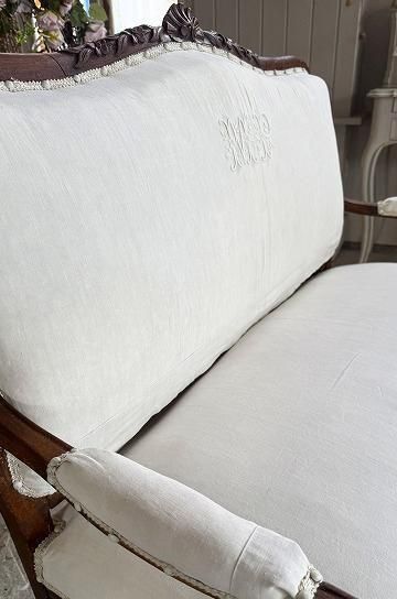 ![]() 背もたれにはモノグラム繊細なモノグラムが手刺繍された100年の歴史を持つフレンチリネン張り。 | ![]() フレームの彫刻とフレンチリネンのエクリュカラーのシートがインテリアに馴染むロココ調ソファです。 | ||||||||||||||