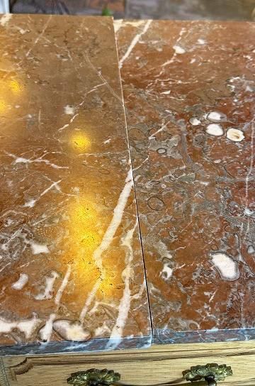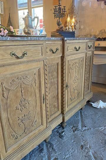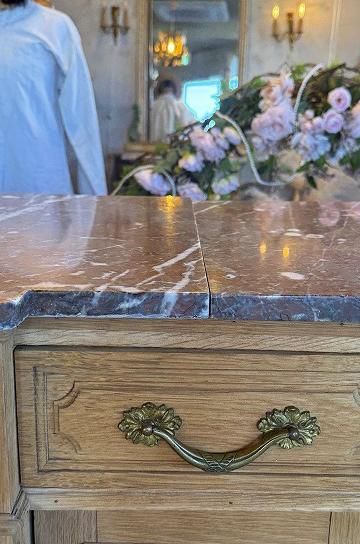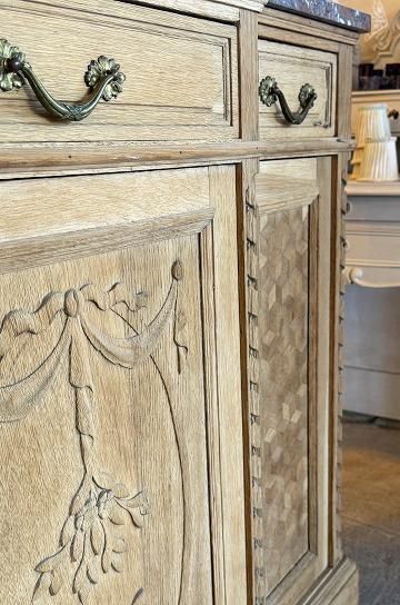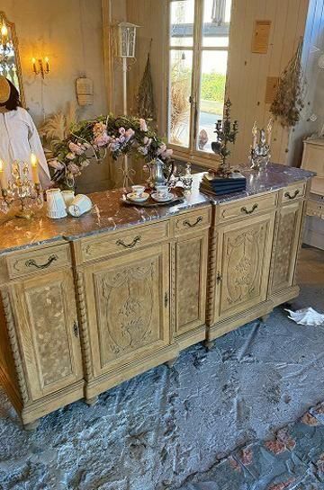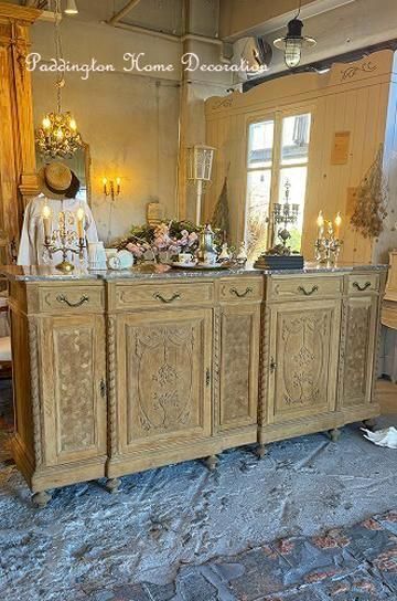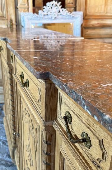 ![]() 丁寧なカーヴィングが施されたオーク材のカップボードです。 | ![]() 天板は赤茶色にグレーが入った重厚な大理石が2枚で分けられています。 | ||||||||||||||