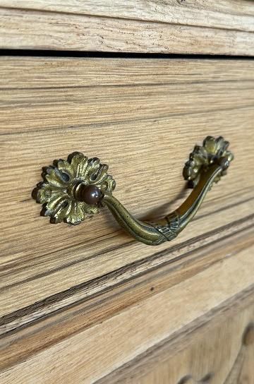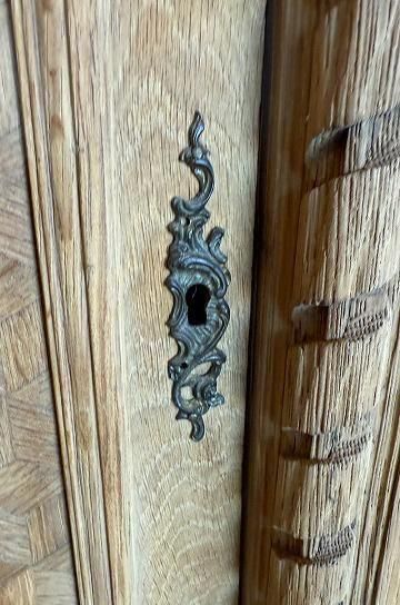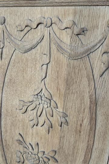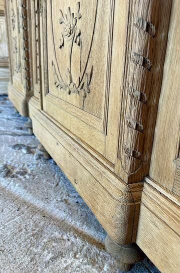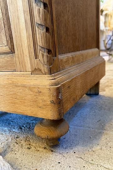 ![]() カップボードはオーク製でサンドブラストしてナチュラルベビー肌が新鮮なカウンターテーブル。 | ![]() 正面には縦模様のクリストレールと花模様が彫刻されています。 | ||||||||||||||