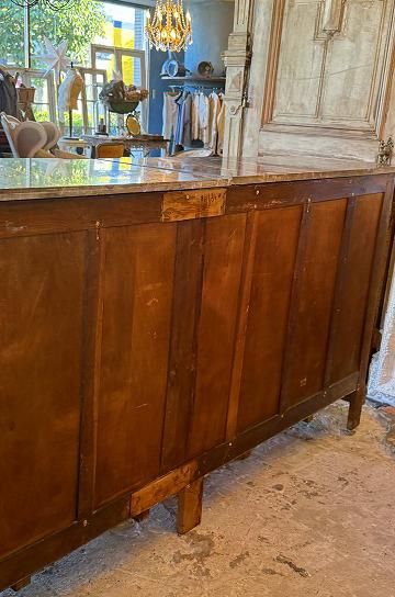 フレンチアンティークのオーク製大理石カップボード。。丁寧なカーヴィングが施されたオーク材のカップボードです。天板は赤茶色にグレーが入った重厚な大理石が2枚で分けられています。カップボードはオーク製でサンドブラストしてナチュラルベビー肌が新鮮なカウンターテーブル。正面には縦模様のクリストレールと花模様が彫刻されています。2センチ厚の大理石の天板の角は丸みのあるエッジで迫力のある存在感のカウンターテーブルとしても。ナチュラル肌のドライな印象が陶器や素材を感じ枯れるディスプレイ向きです。引き出しは真鍮製のつまみがついて趣のある雰囲気です。正面のパネルはエッジがついて立体的なアンティークカウンターテーブルです。扉の中には棚板1枚で仕切られており、広い収納になっています。立ったままでちょうど良い高さのカウンターテーブルとして活躍してくれる壁一面に迫力のあるカウンター向き。100年の時と越えてシルバーに輝く、温もりのあるナチュラル肌と、アンティークならではの使い古された風合い、乾燥し固くしまった風合いが魅力的。フレンチアンティークの大理石カップボードです。 | ![]() | ||||||||||||||