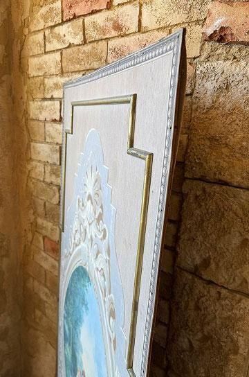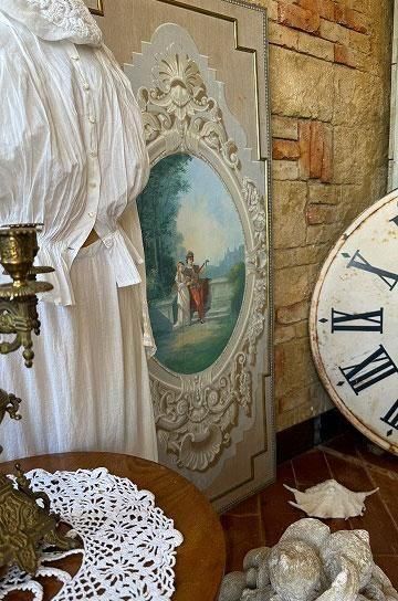 ![]() 真鍮の装飾が額縁のように絵画を囲み、芸術作品そのものの存在感を放ちます。年月を経て柔らかくすれた風合いは、アンティークならではの味わい深さを加えています。 | ![]() ショップやサロンのディスプレイパネルとしてはもちろん、邸宅や新築・リノベーションの空間に取り入れても。 | ||||||||||||||