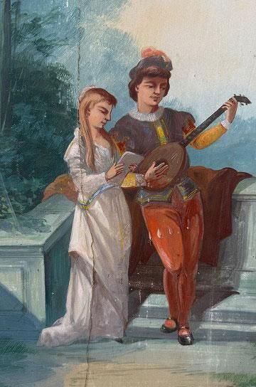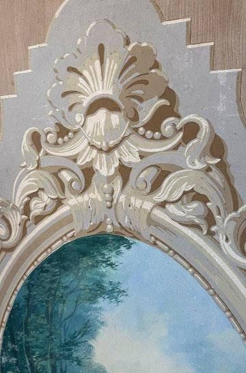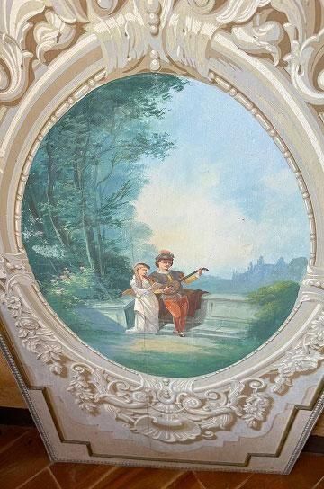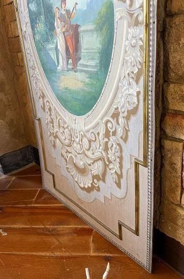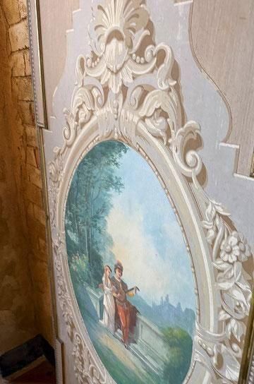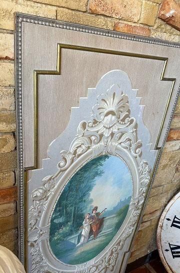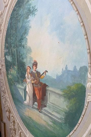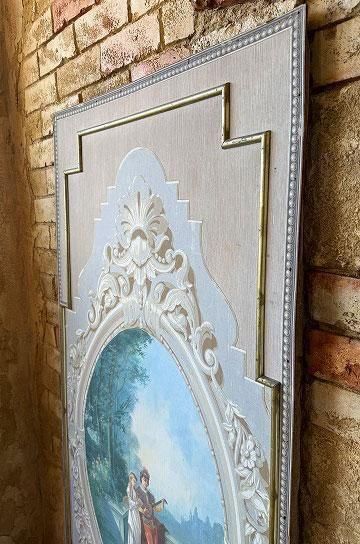 ![]() 華やかなカーヴィングと絵画を組み合わせることで、部屋全体の格を高めるインテリアとして愛されました。 | ![]() こちらのパネルはすべてハンドペイントの油絵で描かれていて、ルイ15世様式らしい優雅なロカイユやアカンサスがあしらわれ、中央には宮殿のテラスで少女とビオラを弾く少年が音楽を奏でる様子を描いた風景画が美しく収められています。 | ||||||||||||||